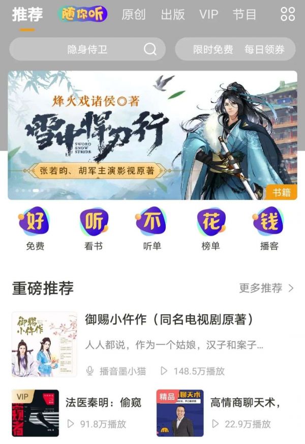 早在2019年,TME就开始发力长音频领域,如QQ音乐开辟出“听书”板块,引入《庆余年》《盗墓笔记》等原著IP有声小说,2020年4月,TME正式发布长音频战略,同时推出长音频新产品“酷我畅听”。