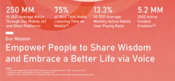 招股书数据显示,喜马拉雅最新的活跃用户,一季度达到2.5亿,平均月活跃移动端付费用户为1390万,但付费率仅为13.3%。