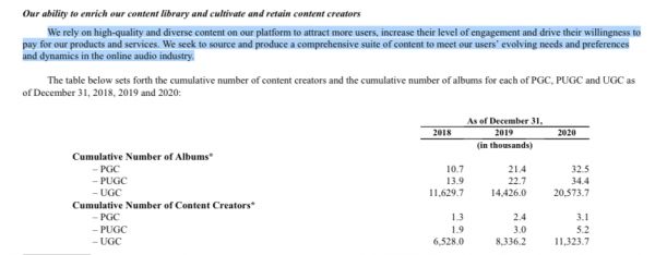 目前,喜马拉雅主要提供三个类型——PGC、UGC、PUGC,2020年相关内容活跃创作者分别为2100名、515万名和4600名,内容占比大约是0.16%、99.67%以及0.17%。