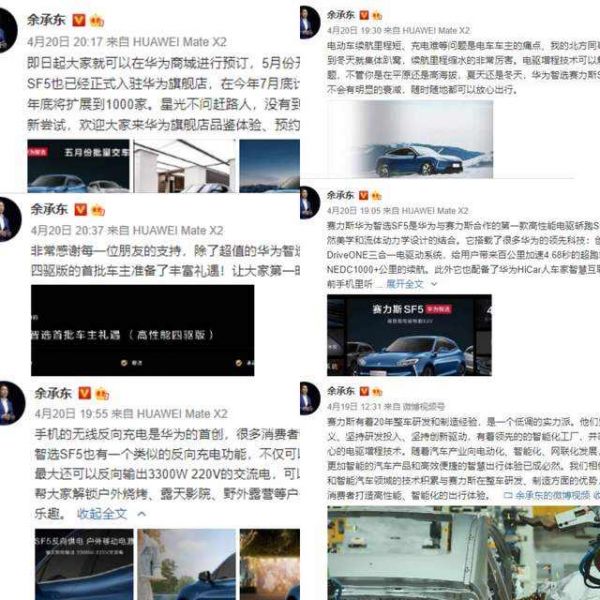 余承东兼任华为“造车”的一把手,从他的微博动态可以一窥端倪。