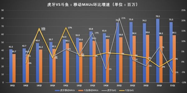 2021年第一季度,虎牙直播移动端MAU(月均活跃用户数)达7550万,较上年同期的7470万,净增80万,比上一季度的7950万减少了400万;斗鱼平均移动MAU从2020年同期的5660万净增250万至5910万,较上一季度的5820万,净增90万。