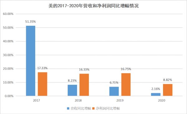 连线出行通过统计2017年至2020年的美的年度财报数据显示,2017年总营收为2419.19亿元,同比增长51.35%,至此之后该项数据的增长率就开始下滑,2018-2019两年的增幅分别为8.23%和6.71%。到了去年,这个增幅甚至下降至2.16%。
