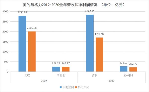 根据公开数据显示,2019全年美的实现营收和净利润分别为2793.81亿元和252.77亿元;而格力同期实现营收和净利润分别为2005.08亿元和248.27亿元。