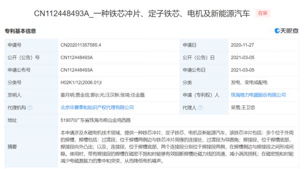 再到今年,或许是看到了美的去年再次入局造车的动向,就在美的发布新品的两月前,格力公开了一项名为“一种铁芯冲片、定子铁芯、电机及新能源汽车”专利技术。