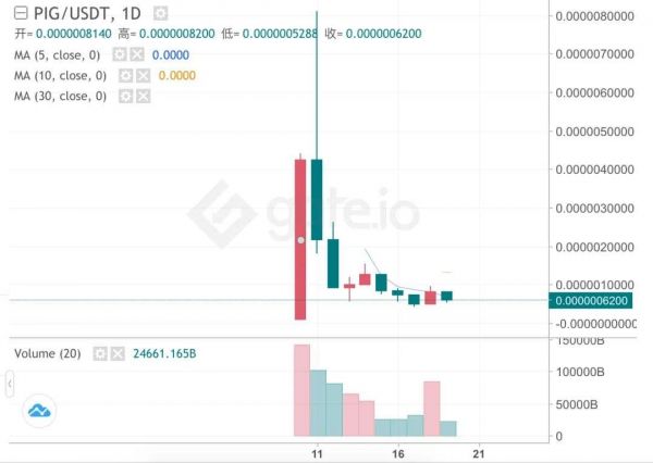 据非小号上猪猪币行情数据,猪猪币上市不到一个月,历史最高价0.00004149元,历史最低价0.00000002元,30天内涨幅近10401%。