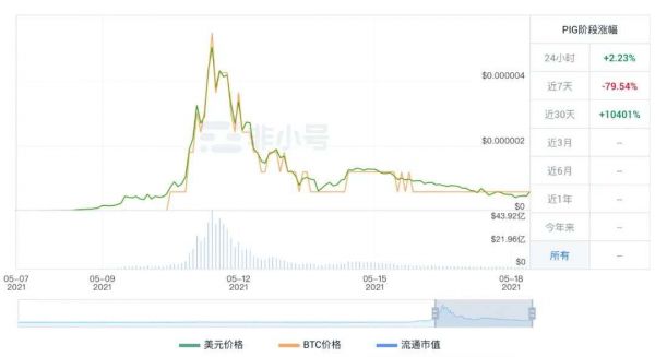 暴涨的数字让币圈新人们无比兴奋,但随后的行情就给“新韭菜们”上了一课。在5月11日以一根大阴线达到最高价格0.0000415元之后,猪猪币短短两天一泻千里,回落到0.00000466元,跌幅近1000%。