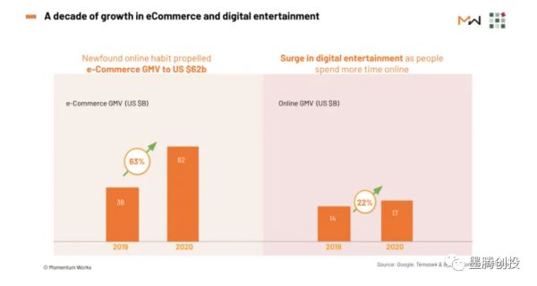 回到东南亚本身。2019年~2020年东南亚地区在电商和数字娱乐领域实现了飞速的发展,下图的数据来自谷歌淡马锡的报告。信不信由你,但是大趋势应该是没错。
