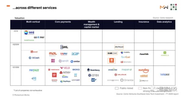 我们也注意到,东南亚许多估值超过1亿美元的公司大多诞生于金融科技领域,或者以金融服务和金融产品的分发作为其重点业务领域。