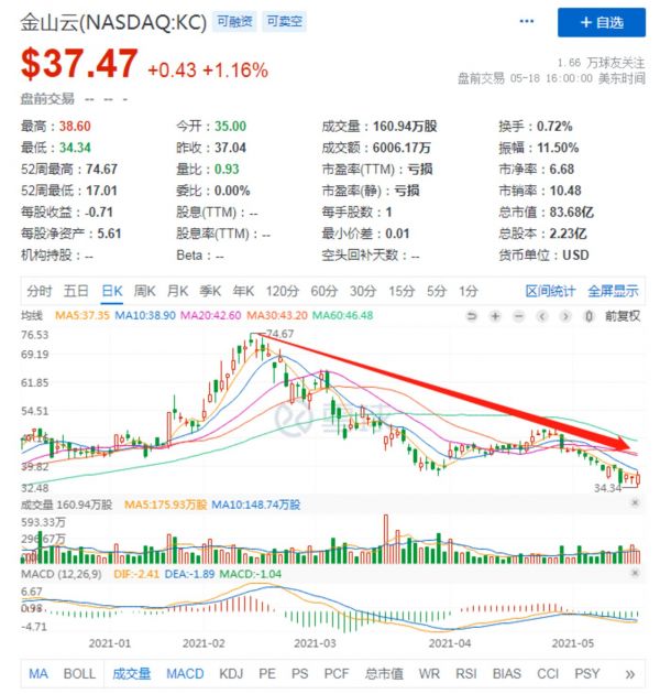 同时美股研究社注意到,金山云在保持业务稳步推进的同时,股价却在三个月内从2月份的近期高点74美元下跌到现在37美元,跌幅近50%。