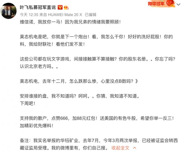 14号,叶飞爆料昊志机电也涉嫌参与市值管理和坐庄,还声称:“去年十二月,怎么跌那么惨,心里没点数吗?”“昊志机电的董秘也骗过叶飞的钱,但是叶飞比较聪明,没有上当。”