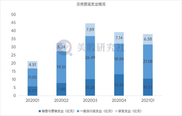 不过,表面上经纪人带来了整体业务规模的扩大、营收和利润提升,相比之下,佣金支出的增速却不容小觑,本季度佣金支出总计142亿元,去年同期为57亿元,同比增长149%。贝壳的支出结构里,线上线下的高联动度带来了大额的佣金与门店支出,又与互联网企业拥有类似水平的带宽运维成本,导致贝壳的毛利率23.3%具有很大的提升空间。复杂的业务体系使得贝壳的管理成本也居高不下。