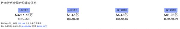 根据BYBT给出的数据,在19日的24小时里有超过72万人爆仓,其中最大一单损失高达6700万美元。国内某虚拟币大佬孙宇晨更是在推特上发推称自己一个拥有60.6万ETH的仓差点被爆,最后紧急调集了2.8亿美元救市才成功保住,60.6万ETH是什么概念?即使是以目前的市值来算也约等于16.48亿美元。
