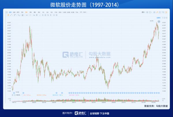 这场春风最后吹出了一场互联网泡沫,纳斯达克100指数顶峰时期市盈率高达85倍。很多互联网概念公司在IPO的时候,就享受2-5倍的股价攀升。老牌强者中,微软股价从1997年到1999年涨幅达到惊人的475%,而消化这个泡沫,微软花了14年时间。