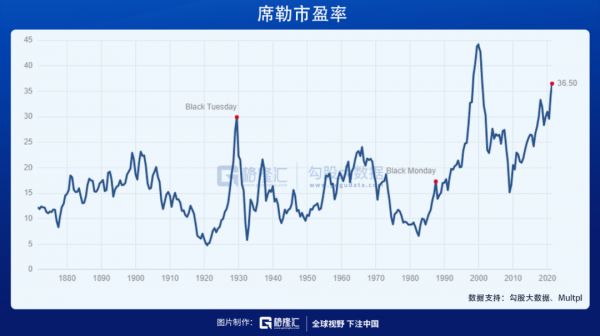2020年疫情,美联储货币超发程度创下历史之最,极低的借贷成本和溢出的流动性推高了各种资产的价格。根据席勒市盈率,标普500当前的估值水平为36.5,超过历史上的绝大部分时间,只低于互联网泡沫顶峰时期。