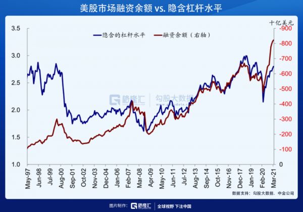 杠杆方面,截止到3月末,美股融资余额超过8000亿美元,隐含的杠杆水平为2.7,低于2018年3倍左右的高点,但已经超过2014年。