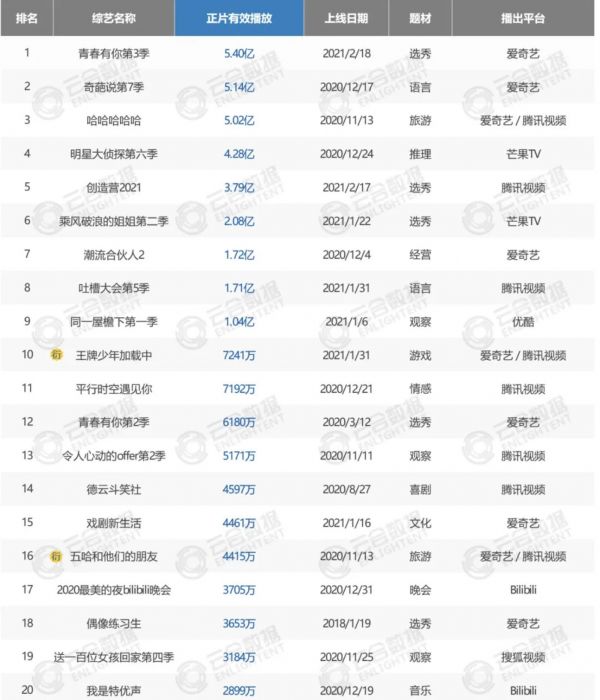 综艺方面,财报重点提及的两档重磅独播综艺《创造营2021》《吐槽大会5》,仅分列在云合2021Q1网络综艺有效播放·霸屏榜TOP20的第5位、第8位;腾讯视频全平台综艺有效播放量环比2020Q4下滑3%,但爱优芒分别上涨了64%、15%、23%。