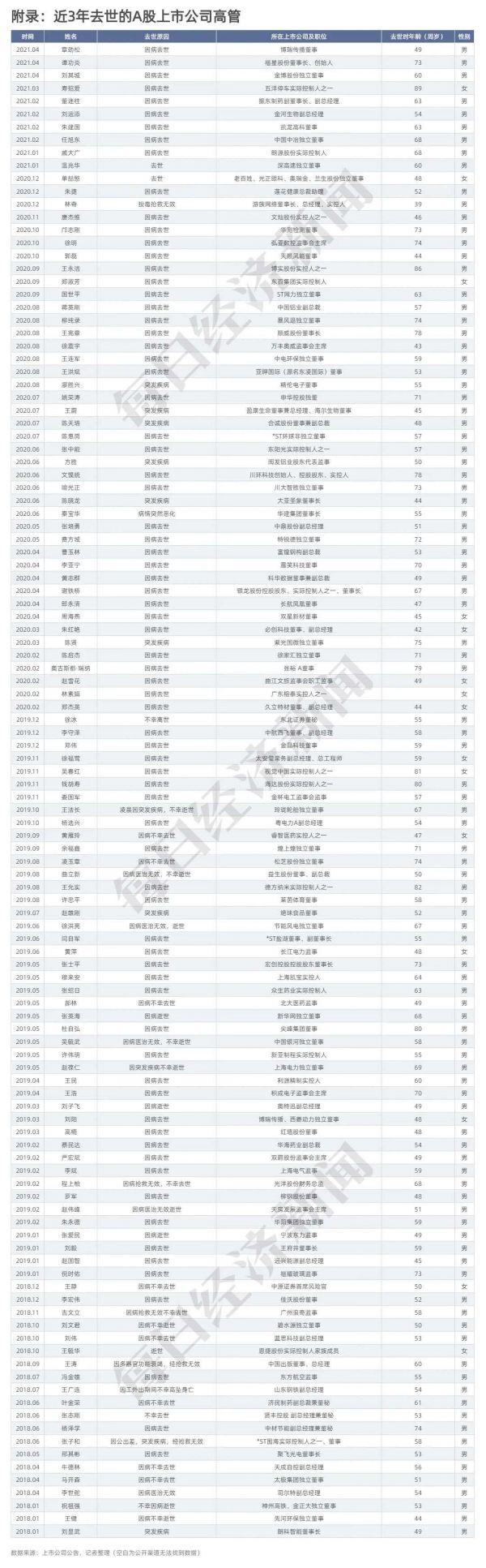 据国家卫健委发布的数据,2019年全国居民的平均预期寿命为77.3岁。而据《每日经济新闻》记者统计,2018年以来共有116名上市公司董监高或实控人等相继离世,除3名逝者未能核查到年龄外,其余去世平均年龄才59岁,比全国居民平均预期寿命少了近18岁。