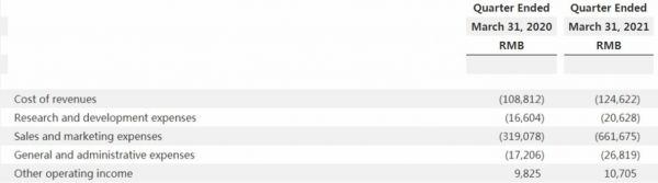 2021年第一季度,怪兽充电的研发支出、销售和市场推广支出、一般和行政支出分别为2060万元、6.617亿元、2680万元,其中销售和市场推广支出占总支出比例高达93%,而该费用相比去年同期也大幅上升,增长幅度为107.4%。