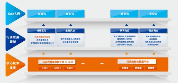 产品层面,中科闻歌将自主研发的“天湖”大数据智算平台和“闻海”全球大数据平台两大核心技术作为系统底座,在安全、金融、媒体、政务等领域形成了从解决方案、软件产品包到 SaaS 的数据智能平台化体系。