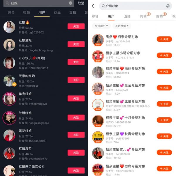 浏览过几个红娘直播间后,文娱君发现,抖音、快手上的相亲直播方式主要有两类: