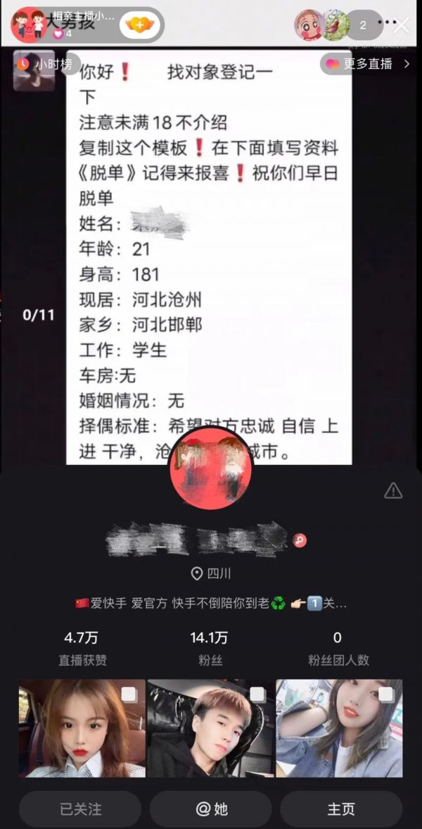 另一类是关注红娘主播的直播间,再根据主页信息添加红娘主播的微信或QQ账号,发自己的资料和照片报名,主播会在直播时实时呈现牵线情况,而这一类通常也是男性收费、女性免费。