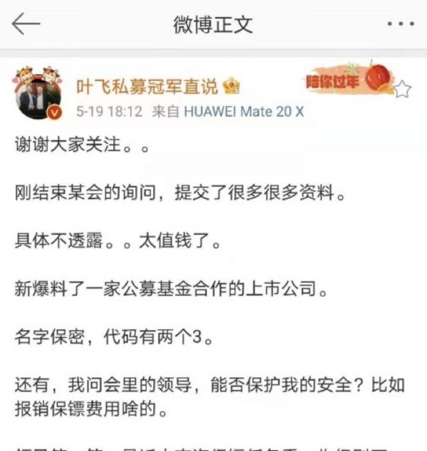 “伪市值管理”之所以被易主席点名批判,源自于昔日“私募冠军”叶飞的连番爆料。近日其在微博发文称,在接受证监会稽查大队询问时,提交很多资料,并且举报了一家公募基金合作的上市公司。