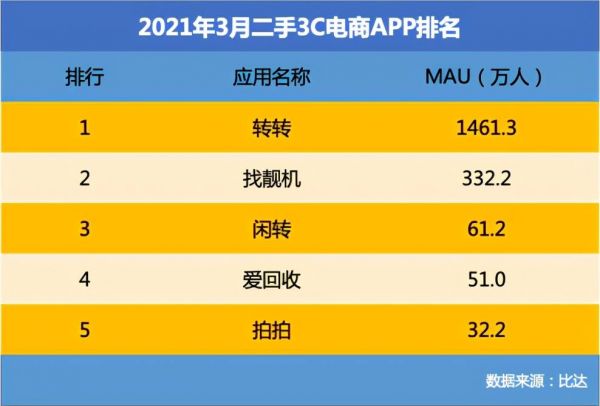 比达咨询(BigData-Research)最新发布的2021年3月二手电商App监测数据显示:在以二手手机3C交易为主的电商平台中,转转集团旗下转转和找靓机分列前两位,总月活用户规模超过千万,已经是垂直平台的20多倍;而爱回收、拍拍等垂直平台的月活用户数和闲鱼、转转集团相比差距巨大,活跃用户规模不及两者的零头。