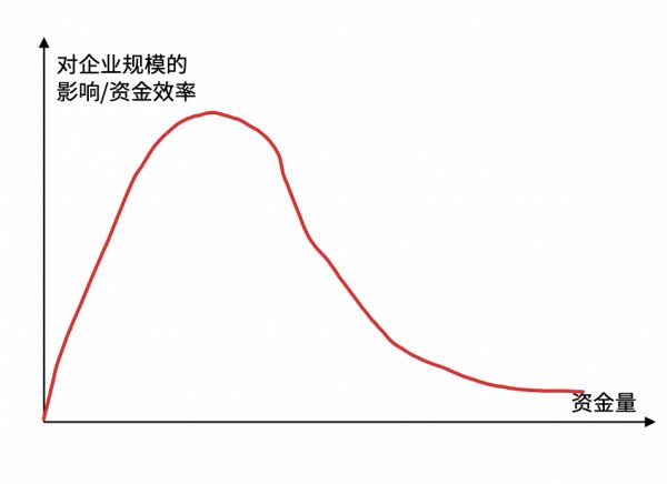 更加特殊的一些行业,比如汽车行业,无论是车规还是上型号,三四年时间可能还在起点,多少钱也不能加速这个过程。换言之,堆钱有用,但用处不大。所谓有用,是指可以保证公司现金流充足,衣食无忧,用处不大是指无法推动公司快速成长。也就是说在到达一定的资金充裕度之后,资金效率的边际效应大幅下降,接近于0,这是技术和制造业的特点。随着企业商业成熟发展到一定程度,开启高速成长模式之后,对资金的需求又会上升,如下图所示,但这个时候也不在早期投资的范围了。