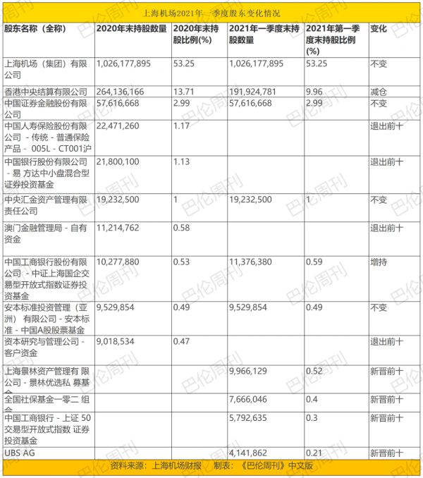 对比上海机场2020年末股东持股情况和2021年第一季度的情况,可以看到“香港中央结算有限公司”是卖出最多的单一股东。其持股比例从由13.71%变为9.96%,下滑3.75%。