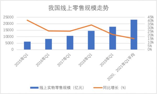 2020和2021年线上实物零售平均增速乃是多年来的新低,值得注意是,2021年Q1线上实物零售占社消规模由上年的23.6%下调到21%,无论在净增抑或是对零售大盘的拉动力方面,线上实物零售都已非过去那般强劲。