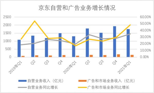 2021年Q1,京东营收同比增长39%,无论是自营亦或是代表开放平台增量的广告和市场收入,其增速都要大于全国线上增速。