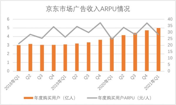 我们在此用两大指标:其一,用户的增长前景,用户代表规模效应,也代表总流量;其二,单用户的广告和市场收益ARPU,这代表商家在京东平台的“税负”,也就是平台对商家的吸引力。见下图