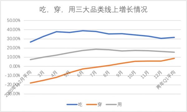 我们仍引入国家统计局数据,我们整理了吃、穿、用三大品类自2020年疫情之后在线上的增长情况,见下图