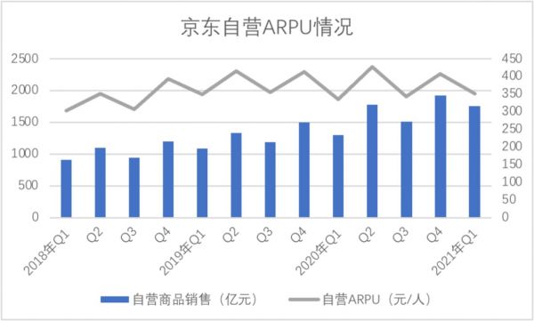 与广告和市场收入以2020年为界限不同,京东自营的ARPU在过去基本呈稳定的增长态势:用户的增长并未稀释单用户消费能力,换言之,单用户的商业价值并未因用户规模增长而下降。