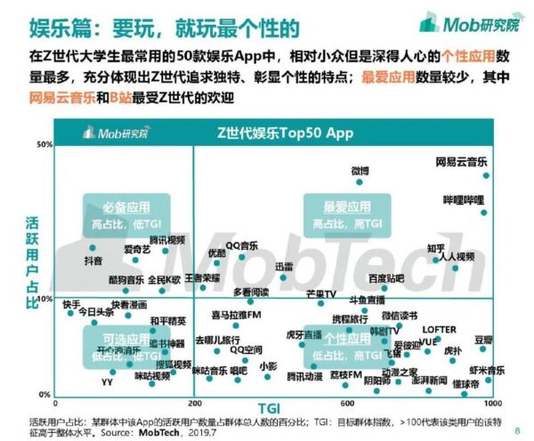 网易云音乐的歌单与推荐机制、共同听歌等带有极强交互属性的功能,都让“云村”成为提供给年轻人社区文化的重要场景,网易云不仅是一个在线音乐平台,同时是为音乐爱好者提供高度互动的內容社区。而据Mob研究院《Z世代大学生图鉴》显示,网易云音乐以高活跃用户占比和高TGI(偏好度)成为最受Z世代大学生欢迎的娱乐APP。