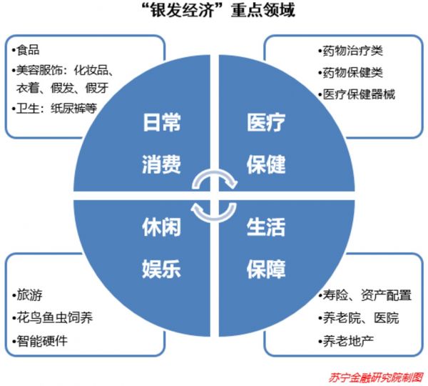 经济社会的不断发展,使得不同年龄层次的老年人在衣、食、住、行、游、购、医、娱等方面,对于消费产品和服务质量都有了更高的要求,这便形成了一个规模庞大、结构多元、丰富多彩的“银发经济”市场,其中仍有很多机会亟待挖掘(见下图)。接下来,各类养老产品与服务有望迎来快速增长期。