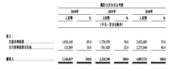 看完成本,咱们来看看营收。网易云音乐的营收主要包括两部分:在线音乐服务收入、社交娱乐服务及其他收入,2020年的占比分别为53.6%和46.4%。