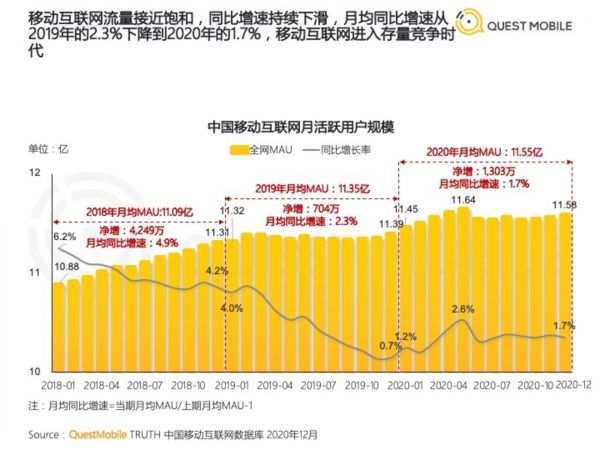 据《QuestMobile2020中国移动互联网年度大报告》,2020年全网月均MAU11.55亿,从年初的11.45 亿到12月的11.58 亿,净增1303万,月均增速只有1.7%。