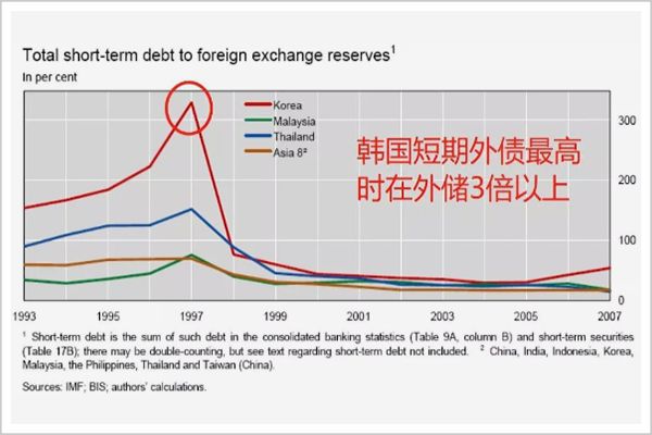 与泰国类似,1997年,韩国的外债高达2000亿美元,其中短期债务1000多亿美元,而外汇储备只有300亿美元,韩元汇率岌岌可危。