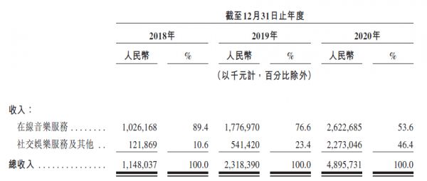 从两大业务的收入占比看,2018年至2020年,网易云的变现渠道正快速向“社交娱乐倾斜”。2018年,在线音乐服务和社交娱乐服务收入占比分别为89.4%和10.6%。至200年,两大业务的收入占比变为53.6%和46.4%。