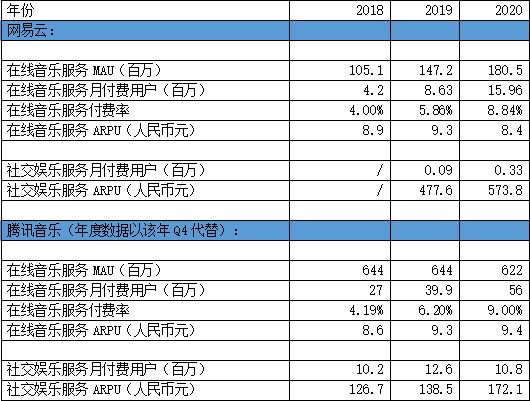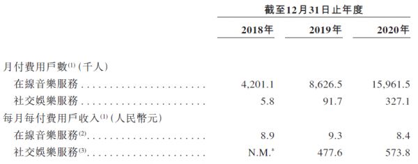 2018年至2020年,网易云每月每名付费用户贡献的在线音乐服务收入分别为8.9元、9.3元及8.4元。而社交娱乐服务贡献的收入分别为N.M.(2018年业务处于起步阶段,产生收入较少)、477.6元及573.8元。