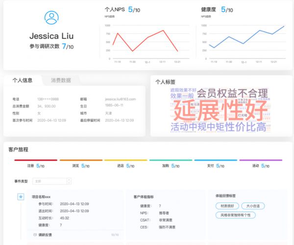 为了将用户体验可视化地表达出来,大树体验云在用户中心增加了用户健康档案的设计,汇集用户的体验数据(互动、态度、观点)、运营数据(消费、行为),描绘出可精细化运营的用户画像。健康度作为直观的用户指标,企业可以对用户的情况一目了然。