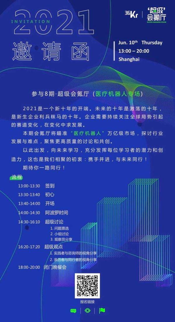 本期医疗器械专场会氪厅,我们将聚焦医疗器械领域的新势力“医疗机器人”所带来的红利,邀请行业资深玩家,共同寻找智能科技赋能医疗新经济的突围之路。