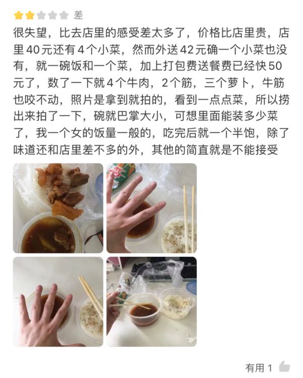 不过陌然更在意的是,外卖平台把持线上流量构建的渠道环境,也让一些商家开始了恶性竞争。平台为了用户活跃,经常会要求商家上线一些优惠活动,用户为了少花钱绞尽脑汁,而商家就通过虚标价格、分量缩水来稳定成本、维持收益。陌然说:“现在外卖烧烤店为了生存就开始乱来,食材的品质、分量都可以打折扣,烤串上的肉越串越小,这都是套路。”