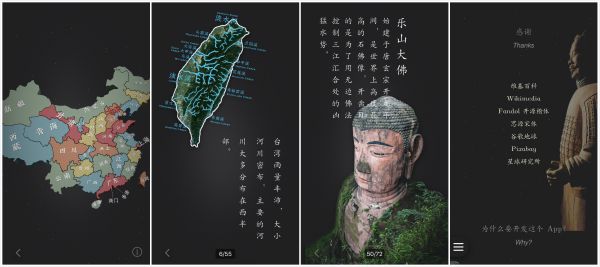 “2018年,我花了一年半的时间走遍了中国所有省份,上溯祖国山川河流,下访各地百姓生活,在这段旅程中我逐渐萌生了一个念头:做一款系统性总结中国各省地理、人文、历史的App。5个月后的今天,它终于完成了。”
