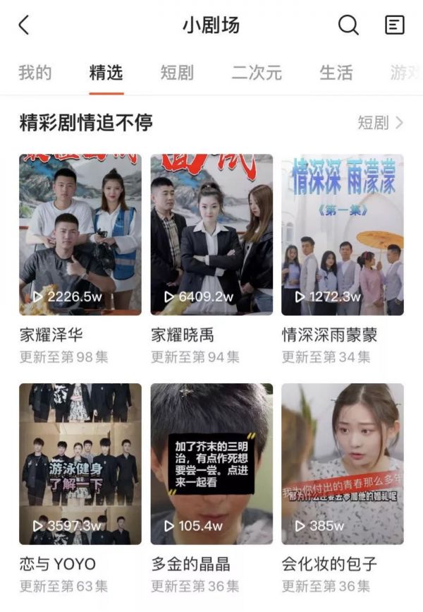 2019年4月,快手上线了小剧场板块,并在同年8月推出了独立APP“追鸭”。快手注重于短剧内容,板块内包括恋爱、动漫、搞笑等多元题材内容。截至2020年上半年,快手小剧场累计收录1.6万部短剧,日活跃用户数超2000万,付费用户超100万。平台上出现了《浮生当铺》《孟婆十九》《奇妙博物馆》等爆款短剧,部分用户已经养成了在快手上追剧的习惯。