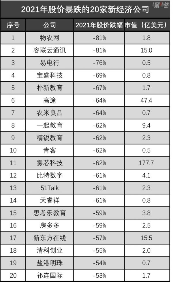 在港美股的所有上市新经济公司中,股价腰斩(跌幅超过50%)的中国公司有26家,跌幅排第一的是物农网,今年股价跌去了81%。排前五的有三家是今年上市,一家是去年12月上市。它们踩在了全球股市下跌的时间点上。
