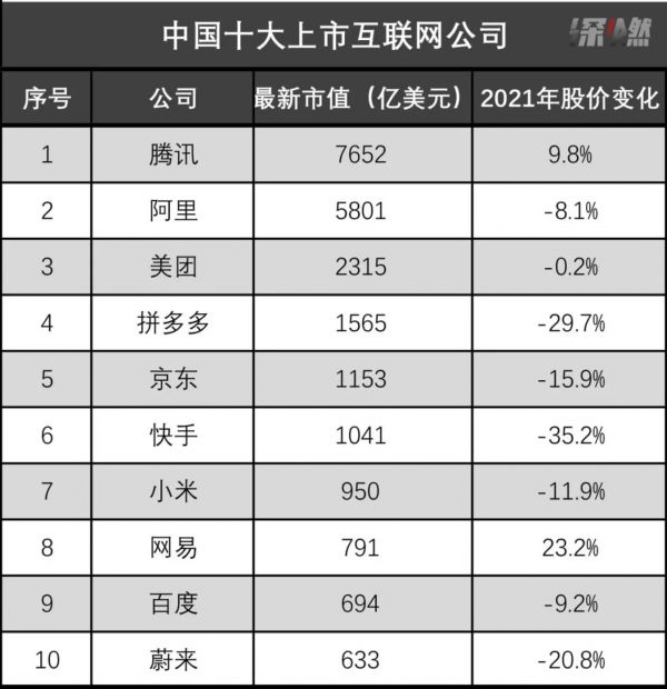 中国十大上市互联网公司市值及股价表现(数据截至2021年5月31日)