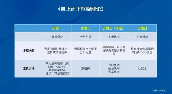 自上而下选用框架具有质量高,框架完善容易,思考速度快等特点,它是先收敛再发散的过程。目的是找一个完整结构,然后围绕结构做“问题细化”。