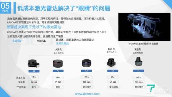 具体从激光雷达产品来说,大体上分为两类:A系列激光雷达是基于三角测距的,或是主打性价比的激光雷达系列;而S系列和T系列是基于光的飞行设计,主打低成本的激光雷达,他们能覆盖的范围已经到40米和80米了,已经和国外顶尖的产品去进行PK了。